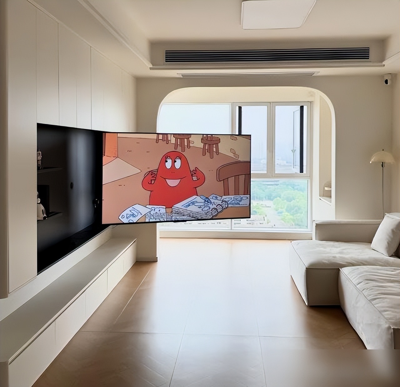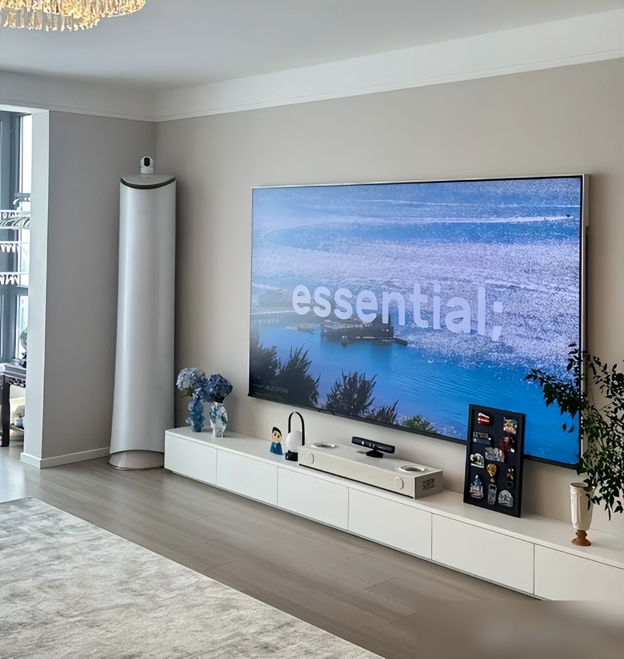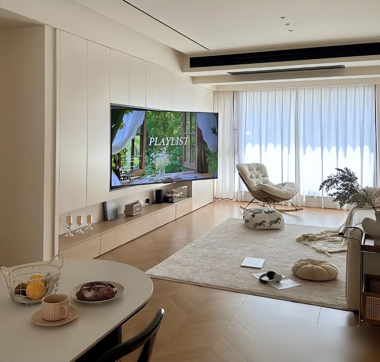 现在倒好,"留白派"直接给墙面放假,预算挪去买台百寸激光屏,画质秒杀一切造型,关机时整块屏幕黑得纯粹,反而成了最昂贵的装饰画。