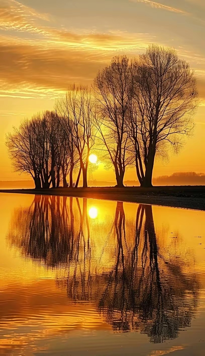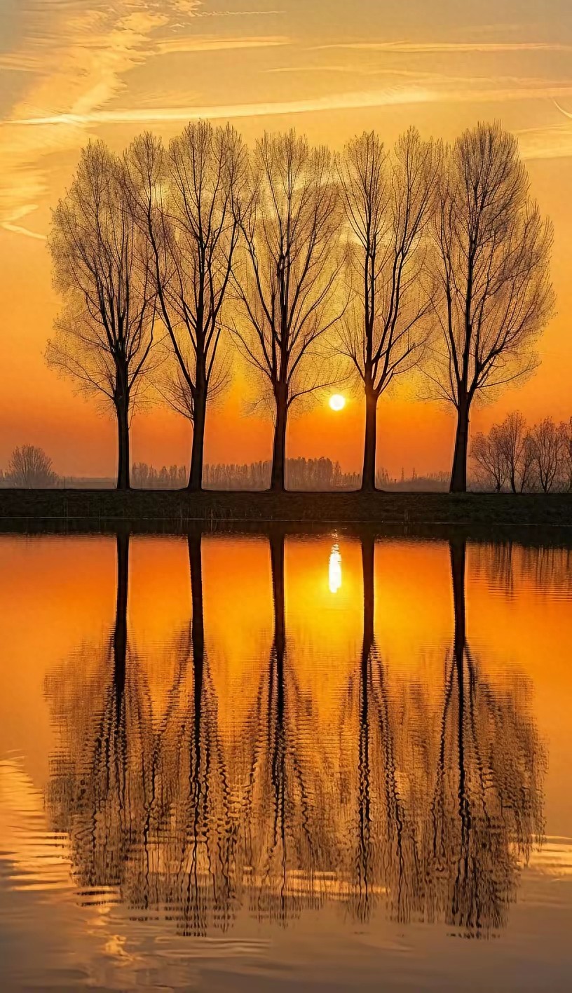 粼粼波光该是夕阳遗落的碎片吧?每一片都盛着金红的光,被水波推着,时而聚成流动的火焰,时而散作星子般的光点,晃得人眼睫都沾了暖意。岸边的长椅还留着行人的余温,方才还喧闹的蝉鸣,不知何时已低了下去,只余下归鸟的翅尖,偶尔划破这层温柔的暮色。