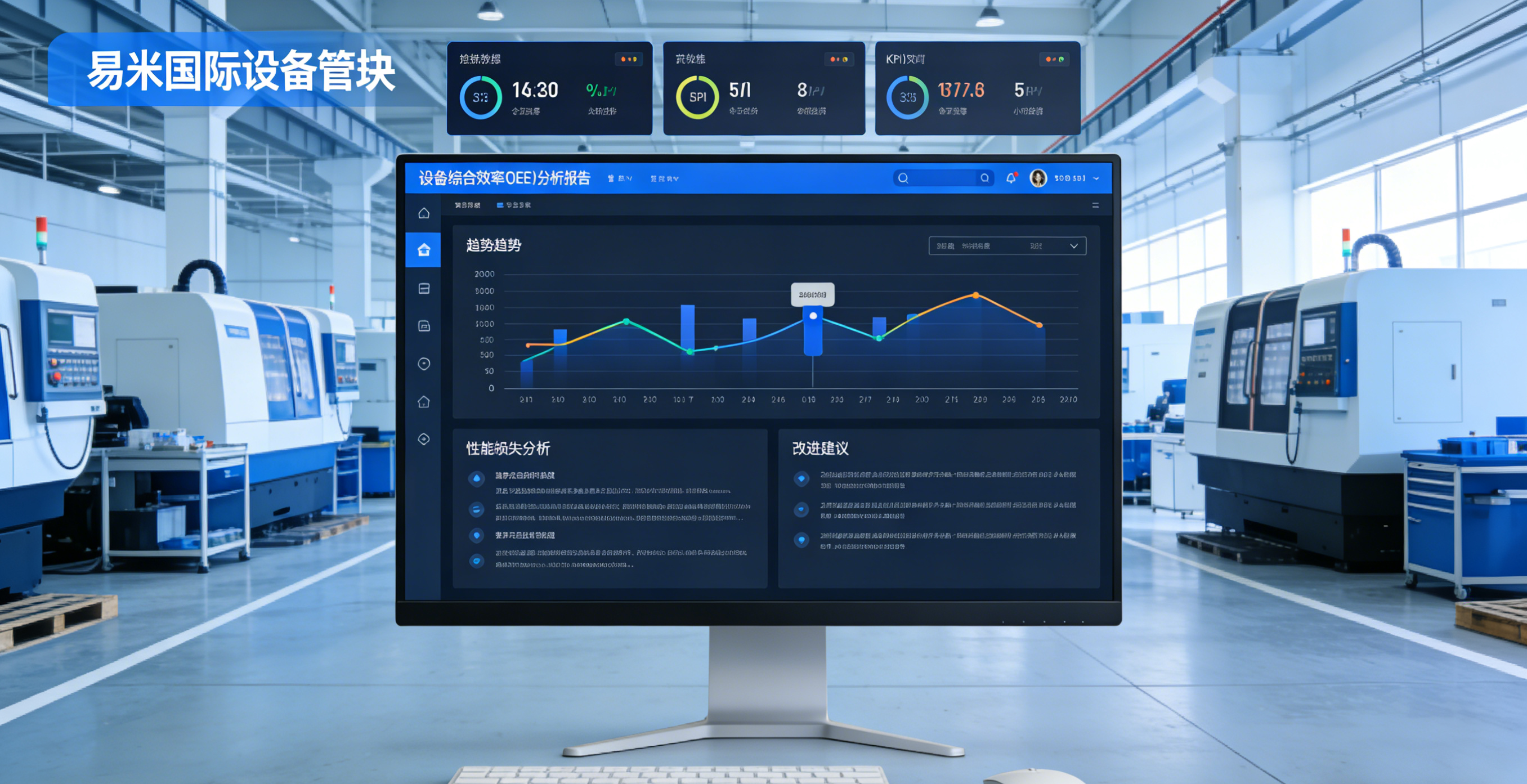 模块与库存、采购模块深度集成。 维修工单或PM计划需要备件时,系统自动检查库存,不足时可一键生成采购申请。备件消耗与具体设备、工单关联,成本归属清晰。通过集成生产数据,系统能自动计算关键指标 设备综合效率(OEE) ,帮助管理者发现设备利用瓶颈。易米国际ERP的设备管理,将固定资产转化为高效、可控的生产力,是制造企业走向智能制造的重要基石。