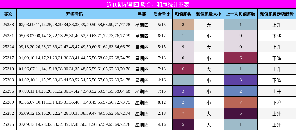 上图展示了近10期星期四的质合比与和尾走势。可见,质合比在5:15与8:12之间反复震荡,而和尾波动幅度较小,平均值为4.2,标准差仅3.2,说明走势相对稳定。本期和值尾数预计下降,关注0-3区间,与上期持平或回落的走势形成呼应。结合质合比与和尾的双重信号,8:12的质合比成为本期核心参考结构,为推荐号码提供基础框架。