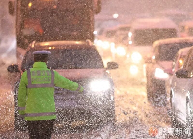 11月6日,乌鲁木齐市公安局交通管理支队高新区(新市区)交警大队二工片区中队交警在雪中指挥交通。