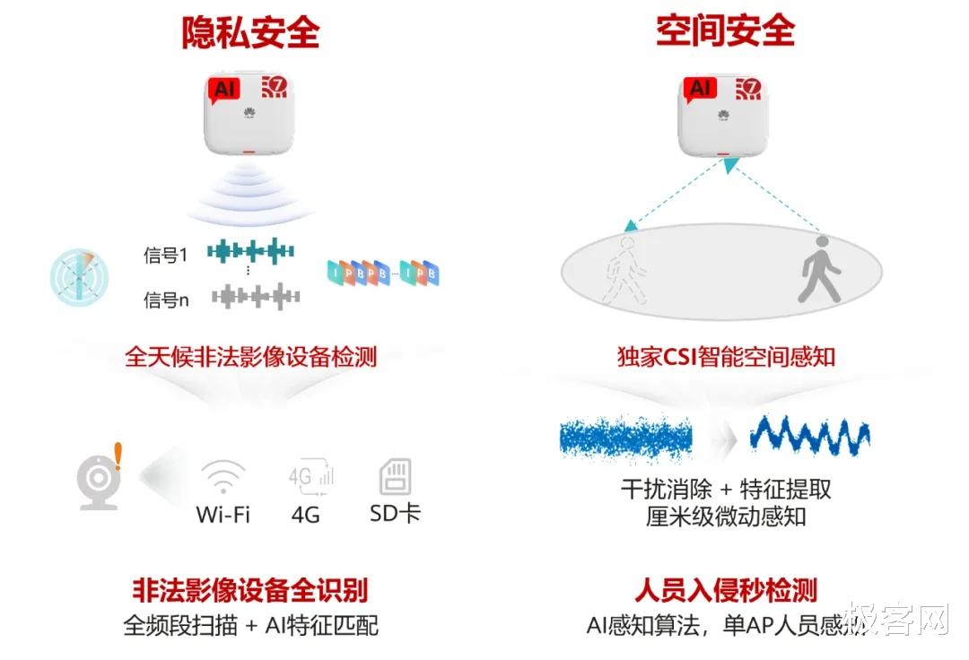 具体看,华为全域安全园区网络解决方案包含四个方面内容:一是资产安全,通过AI终端聚类识别,实现终端“看得清、管得住”,防私接防仿冒,保障资产安全。二是传输安全,采用独家Wi-Fi密盾和端到端MACsec打造最安全数据传输通道,确保数据零泄露。三是空间安全,利用单AP CSI智能空间感知,秒级检测人员入侵;四是隐私安全,通过业界首款防偷拍AP全频段扫描+AI特征匹配,精准识别非法影像设备,规避针孔摄像头偷拍。