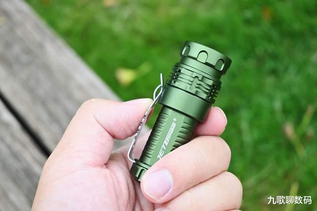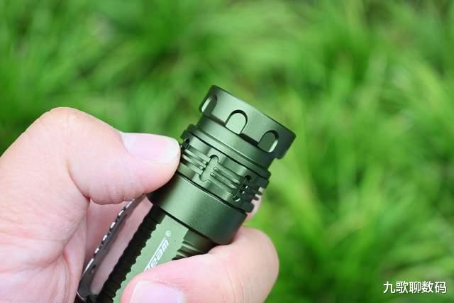 筒身有经典黑和军绿色可供选择,我选的是后者。手电的握持手感还是不错的,单手拿捏、操控都很方便。搭配的不锈钢抱夹为易拆设计,尾端留有手绳孔,夹持力度和紧实度都可以。不过个人感觉如能换成双向抱夹就更好了,那样就可将其夹在帽檐上当做帽灯使用了。