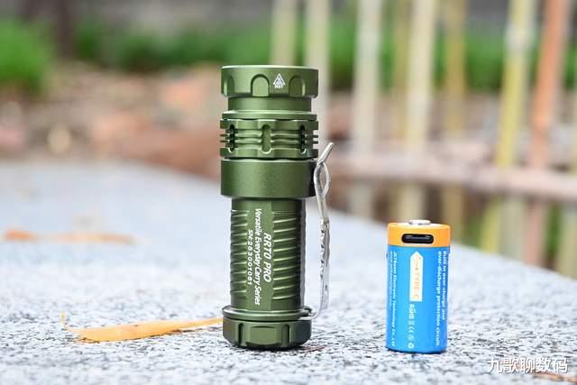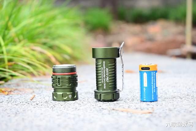 作为RRT0的升级新作,Pro版的性能大幅提升,外观上也更显战术风,可以用硬核、帅气来形容。尺寸上,它相当迷你。筒长为74mm,筒头及尾部直径分别为26.4和24mm。与手边经常随身带着玩儿的一些EDC小玩具放在一起,其大小也不遑多让。加上电池也只有66.5克的重量,可以轻松塞在裤兜、口袋里,随行随用。