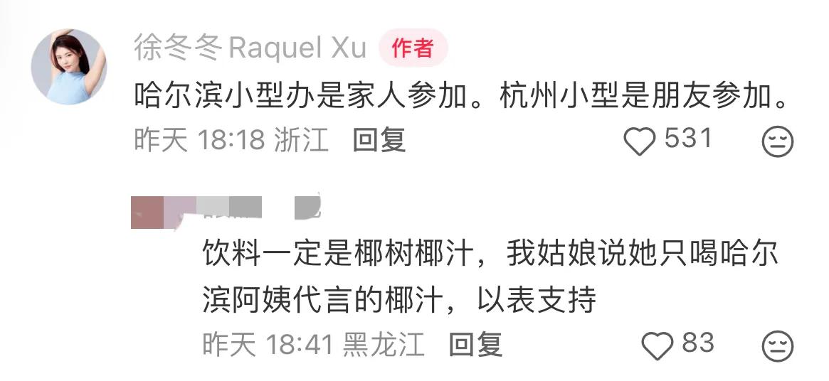 好在徐冬冬也终于妥协,她称在哈尔滨举办的只是家人参加的小型婚礼,另外还会在杭州举办一场邀请朋友参加的婚礼。