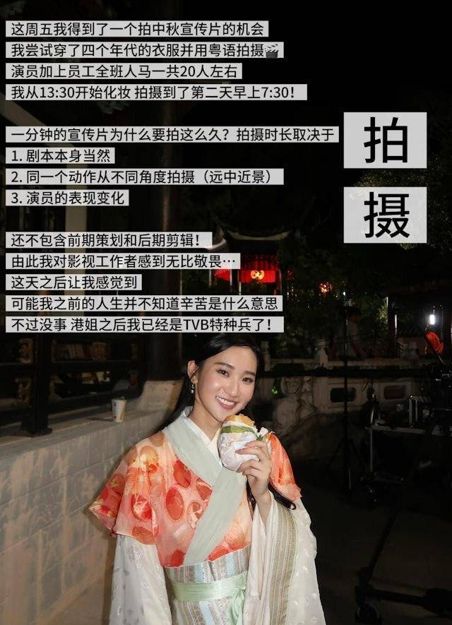 她更表示以前不知道辛苦是怎么回事,如今也体会到了一些工作艰辛,更称自己继港姐之后,已经成为TVB的特种兵。她与现场的工作人员在闲时也有聊天,被问到为什么有勇气参选港姐,她直言不想被朝九晚五的生活所束缚,哪怕落选再继续上班也不迟,最重要是青春无悔。