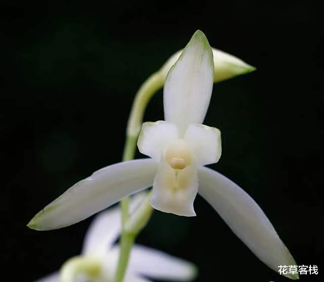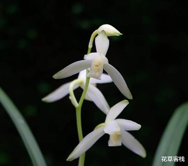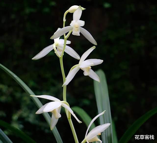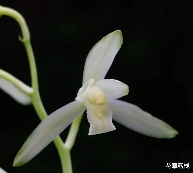 花葶从假鳞茎基部发出,直立,长18-39厘米或更长,一般短于叶,总状花序具4-11朵花。花瓣狭椭圆形或狭卵状椭圆形,长1.3-2.6厘米,宽4-10毫米,近平展,花瓣外周呈绿色,下部洁白如雪,晶莹剔透。花期通常为5-11月。