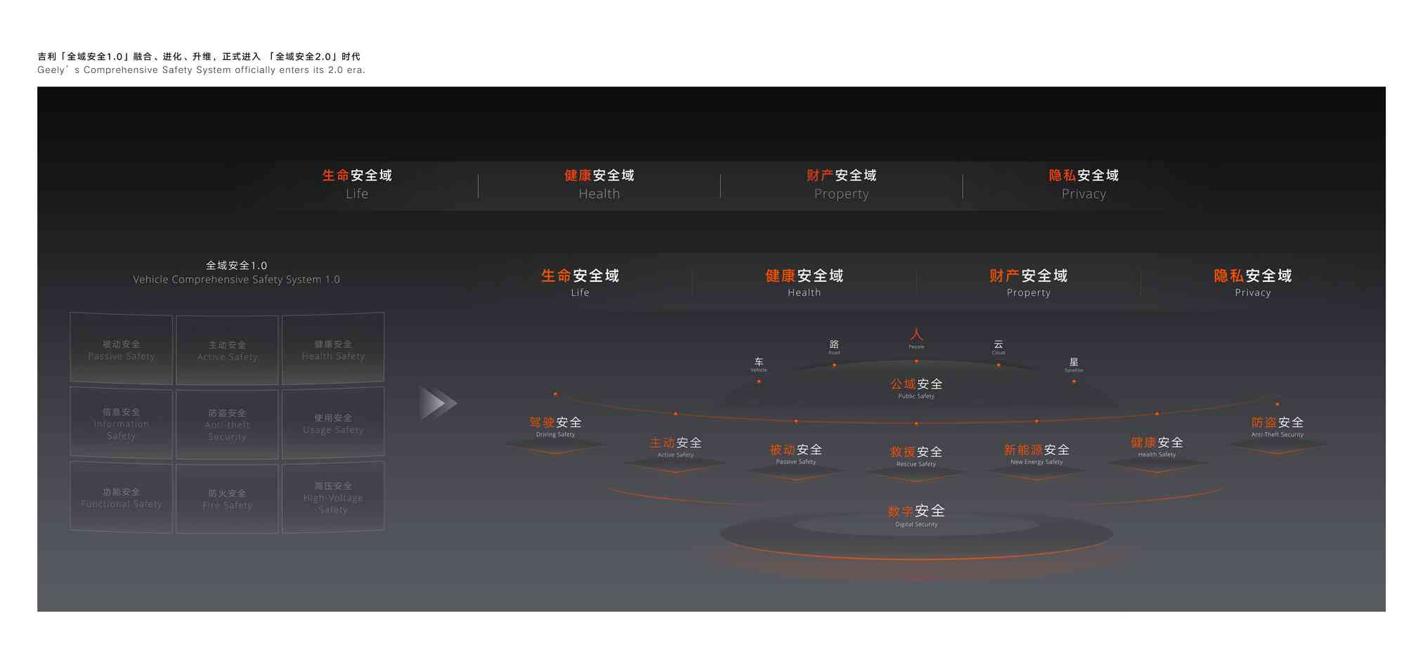 作为行业安全技术的先行者与引领者,吉利在“全域AI”技术体系的赋能下,以“AI为纲 责任为本”,基于原有的“全域安全”技术体系进阶打造“全域安全2.0”技术体系。结合智能时代的安全新需求和新挑战,“全域安全2.0”技术体系秉持“以人为尊”理念,通过技术升级、能力突破与范式创新,将侧重“整车安全”的视角升级为“人-车-路-云-星”的生态视角,旨在贯穿用户出行全场景、覆盖出行全领域、联动出行全生态;并以“生命零伤亡、健康零危害、财产零损失、隐私零泄露”四大安全愿景为指引,逐步构建的一套为消费者提供全面的安全保障技术体系。