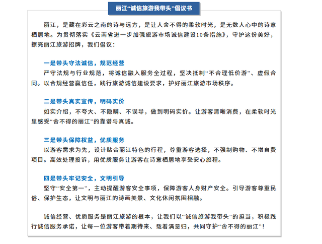 丽江,是藏在彩云之南的诗与远方,是让人舍不得的柔软时光,是无数人心中的诗意栖居地。为贯彻落实《云南省进一步加强旅游市场诚信建设10条措施》,守护这份美好,擦亮丽江旅游招牌,我们倡议: