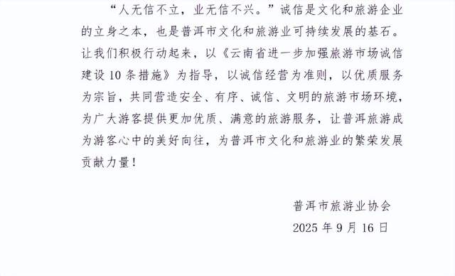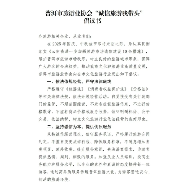 中秋国庆长假即将到来,让我们看看云南各州市“诚信旅游我带头”《倡议书》吧!普洱市旅游业协会:“人无信不立,业无信不兴。”