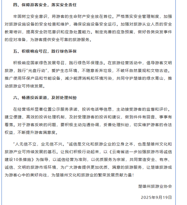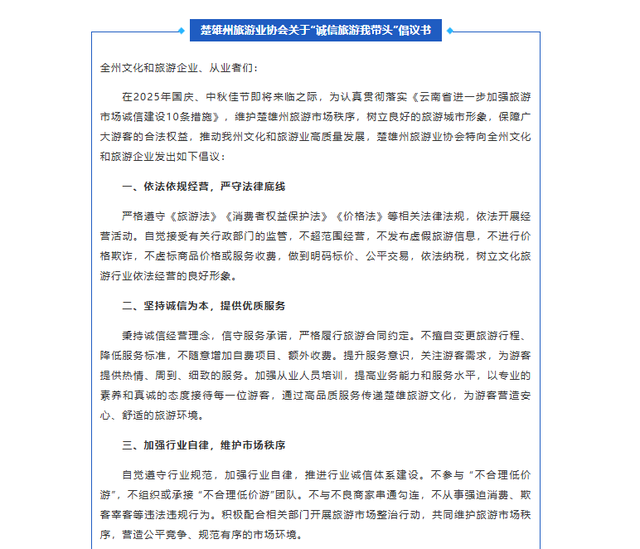 在2025年国庆、中秋佳节即将来临之际,为认真贯彻落实《云南省进一步加强旅游市场诚信建设10条措施》,维护楚雄州旅游市场秩序,树立良好的旅游城市形象,保障广大游客的合法权益,推动我州文化和旅游业高质量发展,楚雄州旅游业协会特向全州文化和旅游企业发出如下倡议: