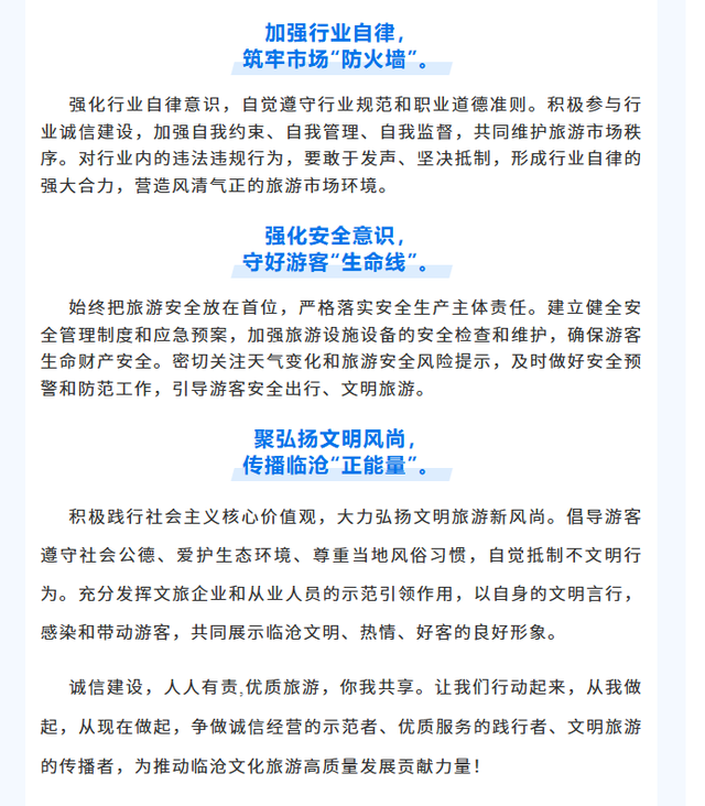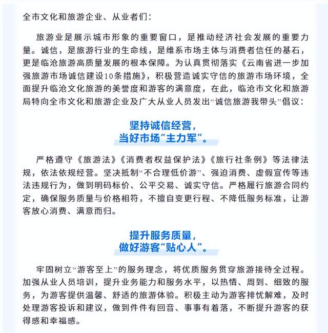 旅游业是展示城市形象的重要窗口,是推动经济社会发展的重要力量。诚信,是旅游行业的生命线,是维系市场主体与消费者信任的基石,更是临沧旅游高质量发展的根本保障。为认真贯彻落实《云南省进一步加强旅游市场诚信建设10条措施》,积极营造诚实守信的旅游市场环境,全面提升临沧文化旅游的美誉度和游客的满意度,在此,临沧市文化和旅游局特向全市文化和旅游企业及广大从业人员发出“诚信旅游我带头”倡议:
