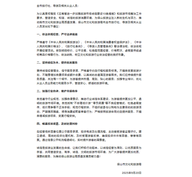 为认真贯彻落实《云南省进一步加强旅游市场诚信建设10条措施》和旅游市场整治工作要求,营造安全、和谐、诚信的旅游消费环境,为保山旅游业注入新的生机与活力,推动我市文化和旅游业高质量发展,保山市文化和旅游局向全市旅行社、导游及相关从业人员发出如下倡议: