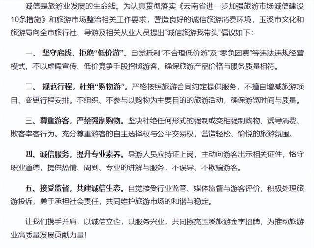 诚信是旅游业发展的生命线。为认真贯彻落实《云南省进一步加强旅游市场诚信建设10条措施》和旅游市场整治相关工作要求,营造良好的诚信旅游消费环境,玉溪市文化和旅游局向全市旅行社、导游及相关从业人员提出“诚信旅游我带头”倡议: