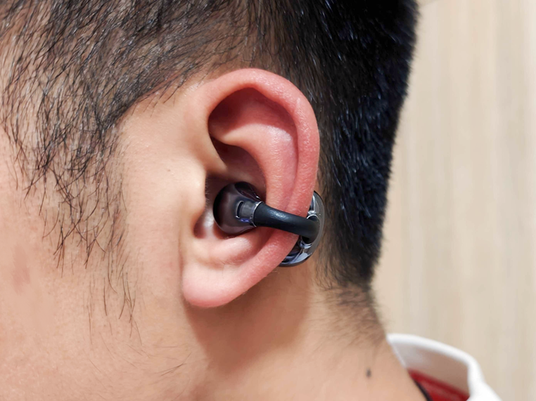 只需轻撑弧形臂,滑入耳廓,微调至发声孔正对耳道即可完成佩戴。位置正确的话,即使剧烈运动也牢固可靠。对油耳用户来说,这种开放结构让耳朵保持清爽洁净。