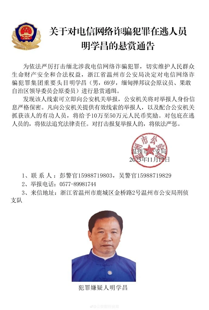 从去年开始,中国联合泰国、老挝、缅甸开展多边执法行动,随后公安部直接发布通缉令,对明学昌、白所成、魏怀仁等头目公开悬赏,最高奖金达50万元。