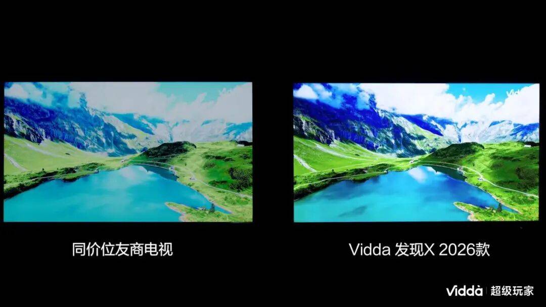 Vidda没玩文字游戏,直接上了 “极限测试”:姜龙手里拿着超过汽车大灯亮度的手电,直接照射两台电视 —— 图片右侧是发现 X2026(搭载墨晶屏),左侧则是宣称 “行业最低 LR 低反率” 的高端电视。结果一目了然:左侧电视出现刺眼的大光晕,画面都看不清;而发现 X2026 只有轻微柔和的光斑,画面依然清晰。