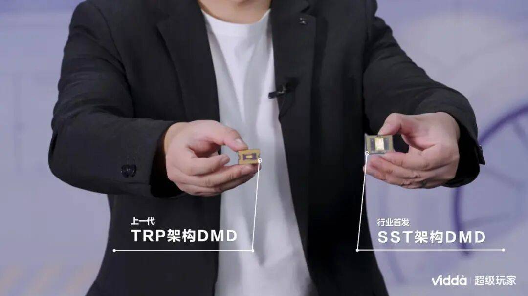 首先是SST 架构 DMD 芯片,这是行业里首个应用在消费级投影上的架构,用姜龙的话说就是 “百万影院同款”。之前行业里 4000 元到 2 万元的产品,大多用的是 2013 年前后推出的 0.47" TRP 架构 DMD,这款芯片在 3500 流明以内还能稳定工作,超过就容易出故障。而 SST 架构的功率密度达到了 60 W/cm²,是前代的三倍,能承载的亮度直接飙升到 10000 流明级别,而且封装面积提升了 7 倍,散热更好。这就好比给投影换了个 “更强的心脏”,为高亮度打下了基础。