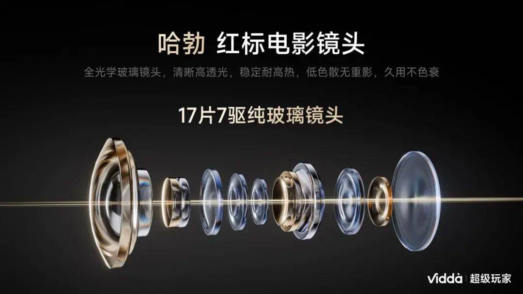 最后是Φ122mm 影院级大镜头,这是 C5 “影院感” 的关键。之前 Vidda C3 Ultra 的镜头已经是行业标杆,而 C5 的镜头更是直接按专业影院规格定制 —— 内部是 17 片纯玻璃镜片组,全金属镜筒包裹,解析力达到了超 10 万级。姜龙说这是 “十几年死磕超短焦镜头的积累”,毕竟对 Vidda 来说,做长焦镜头的难度比超短焦低多了。这款镜头还带可变光圈,7 级调节能适配不同场景:白天开最大光圈保证通透,暗场影片开最小光圈让黑位更纯粹,中间的 “标准模式” 则能应对多数日常场景。这种灵活性,正是家用投影最需要的 —— 不用为了光线反复调整机器,按下遥控器就能有好画面。