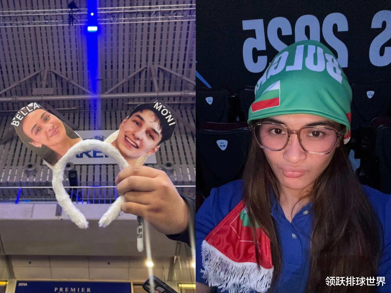 随后贝拉没有浅尝辄止,她被拍到在赛后粉丝互动区中耐心排队,眼神专注地等待与尼科洛夫的互动机会,站在尼科洛夫身边笑得灿烂,不止如此,身穿带有保加利亚标志的T恤,还围上保加利亚围巾,更戴着一条特殊头带,上面赫然印着她和尼科洛夫的合照,瞬间引爆“磕糖”热度。
