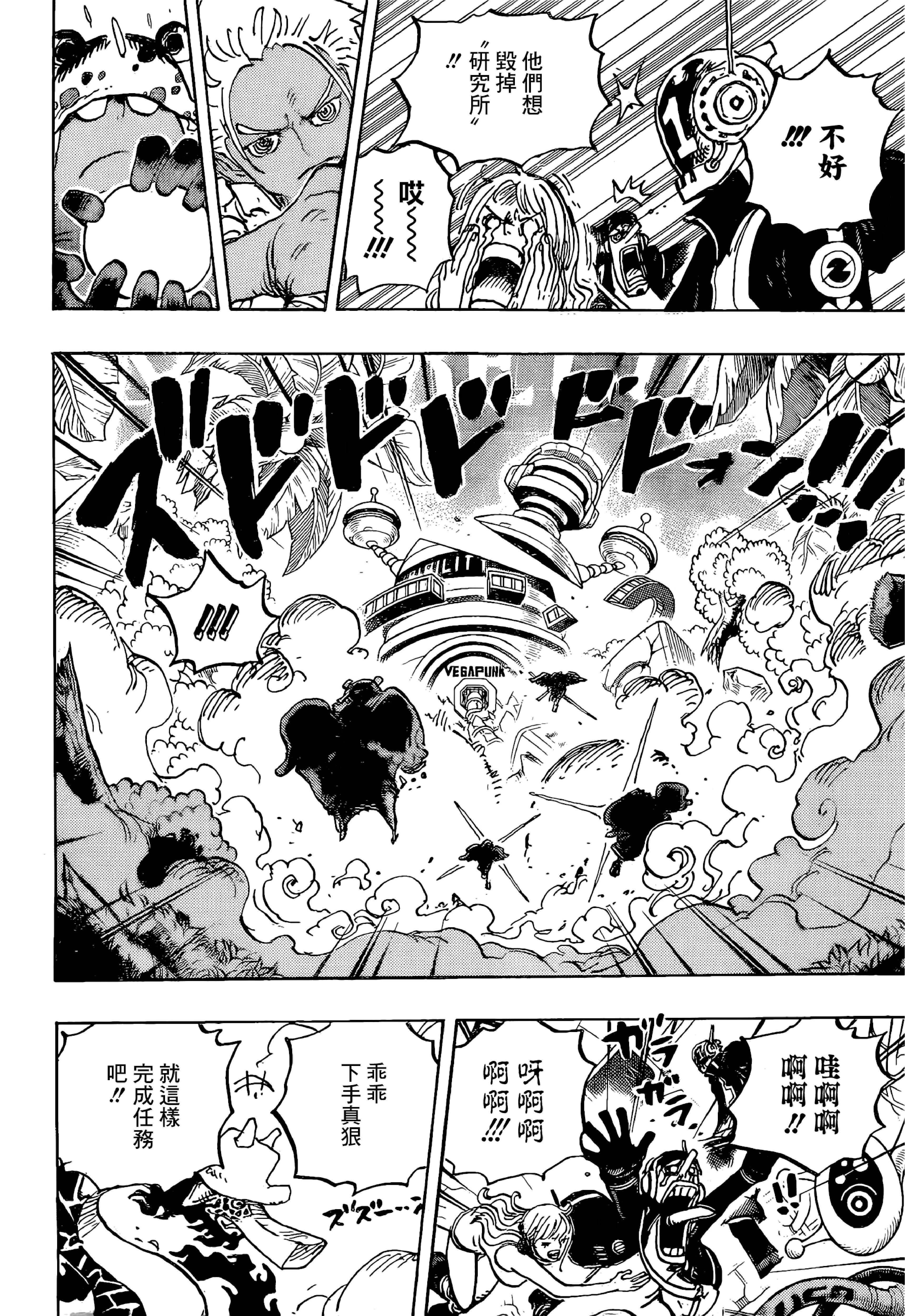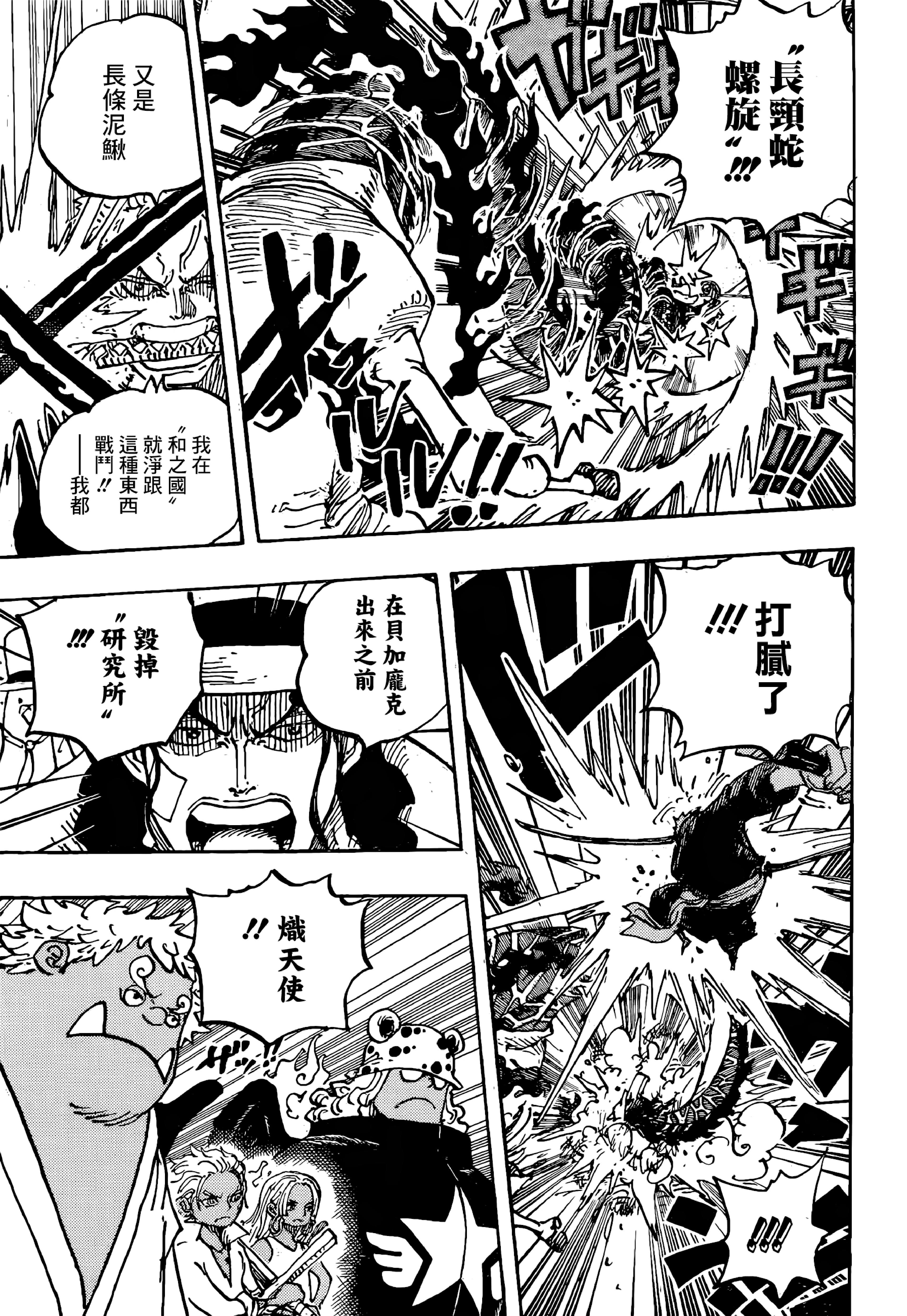 在另一边,索隆与觉醒状态的卡库展开了激烈对决。卡库的觉醒让他拥有了极强的威慑力,但索隆依靠冷静的判断和坚固的剑气,成功压制了卡库的动作,甚至嘲讽地称他“站不住脚”。山治在战斗结束后前往支援,展示了草帽团的紧密配合