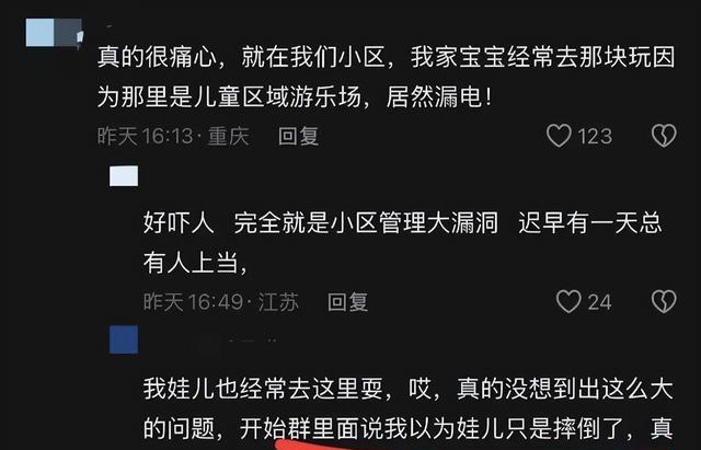 随着事件被越来越来人看到,相继也出现了不少知情者,有人爆出了小区名字,还有人感到后怕,一位网友直言,自己家就在这小区,而事发区域正是儿童区域游乐场,跟着有人附和,自己家孩子也经常去那玩,没想到出了这么大问题。