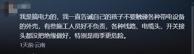同时还有“内行”网友称,自己一直告诫孩子别动带电设备外壳,矛头直指一些施工人员,称部分人都不把绝缘做好,尤其是在雨季还要更加危险。