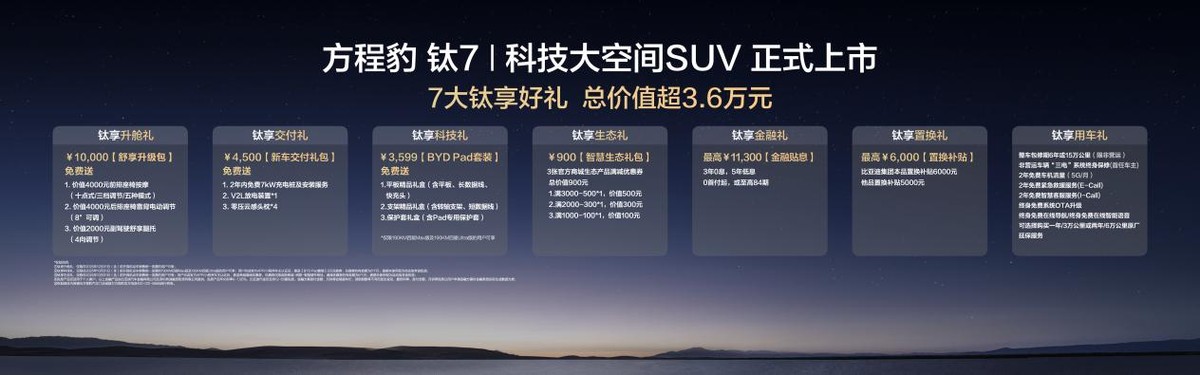 在购车权益上,方程豹更是诚意十足,为首批车主带来了总价值最高超3.6万元的7大钛享好礼!其中包括:覆盖多项座椅舒适配置的总价值10000元舒享升级包、价值 3599元的 BYD Pad套装、价值 4500 元的新车交付礼包均免费送;提供3年0息、5年低息、0首付起或至高 84期等多重金融方案以供选择,金融贴息最高价值 11300 元;还有最高价值6000 元的置换补贴价值 900 元的智慧生态礼包,以及2年 5G 每个月的免费车机流量、非营运车辆长达6年或 15万公里的整车包修、“三电”系统的终身保修、终身免费系统 OTA 升级等,让每一个家庭都能轻松拥抱钛7,让美好生活触手可及。