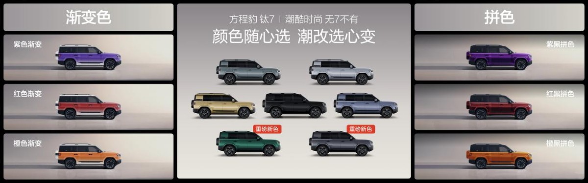 为了让广大用户选得尽兴,钛7直接一步到位,带来了7款外观颜色、3 款内饰颜色,同步在官方商城上架了6款潮改方案,可满足不同用户的审美偏好。