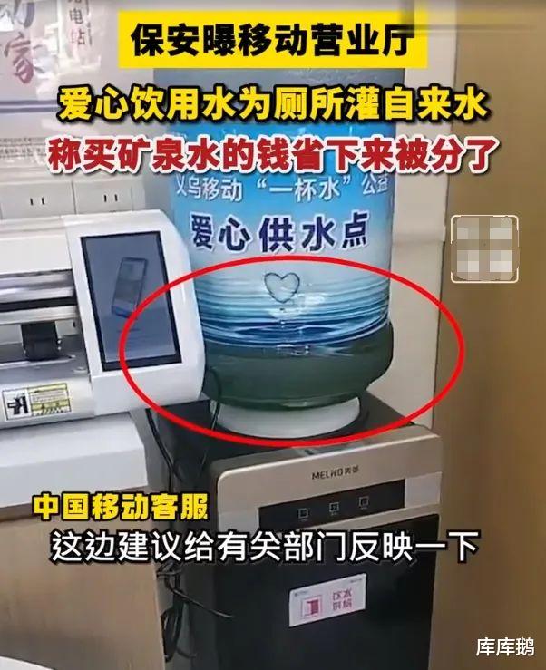 近日,浙江金华一中国移动营业厅的保安举报称,去年为了节约成本,营业厅把从厕所接的自来水灌进矿泉水桶,未经消毒给人喝。