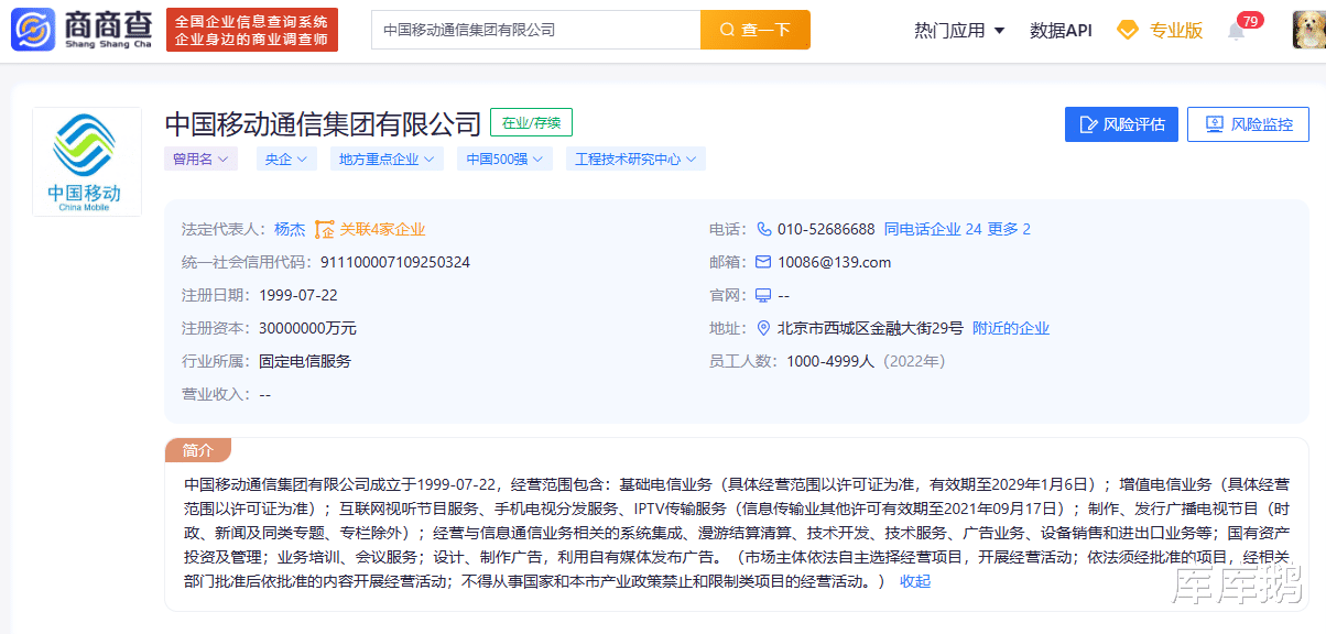商商查显示,中国移动通信集团有限公司成立于1999-07-22,法定代表人是杨杰,经营范围包含:基础电信业务(具体经营范围以许可证为准,有效期至2029年1月6日);增值电信业务(具体经营范围以许可证为准);互联网视听节目服务等。