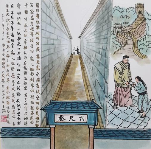 张英看了信后,认为应该谦让邻里,他在给家里的回信中写了四句话:“千里家书只为墙,让他三尺又何妨?万里长城今犹在,不见当年秦始皇。”家人阅罢,明白其中含义,主动让出三尺空地。吴家见状深受感动,也主动让出三尺房基地,“六尺巷” 由此得名。