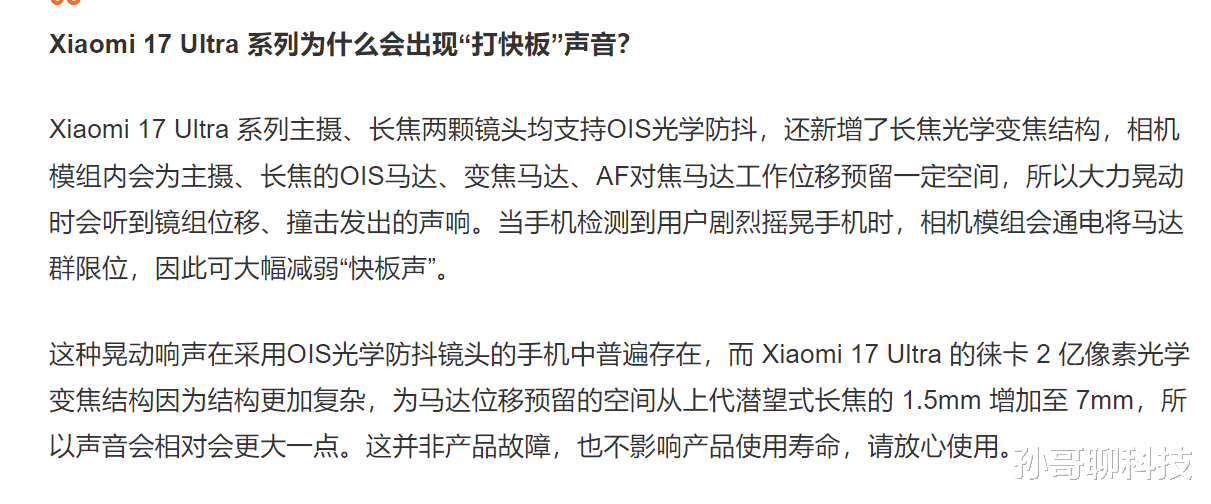 面对网友质疑,小米官方正面回应。认为小米17 Ultra系列主摄、长焦两颗镜头均支持OIS光学防抖,首次支持长焦光学变焦结构。由于采用全新设计,相机模组需要留出更多空间,所以大力晃动时听到镜主位移,撞击发生的响声。为避免声音影响过大,相机模组通电将马达群限位减弱“快板声”,是正常现象,不是故障,不影响使用。