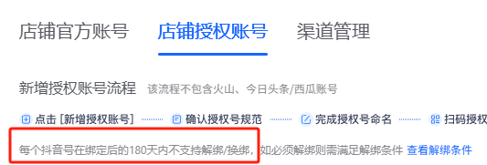 商家绑定店铺授权号是商家实现多账号为店铺0佣金带货的方式,但是这种方式有个弊端:店铺授权号一旦成功绑定,180天内无法解绑。