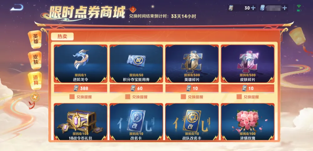 限时点券商城开放,参与新春系列活动可得大量限时点券兑好礼,包括敖隐的进阶龙令、曹操的全新史诗限定皮肤等。