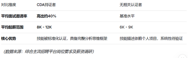 数据证明价值根据行业调研数据显示,持有CDA证书的数据分析师,在求职成功率及起薪水平上均有显著优势。下图清晰展示了这一对比: