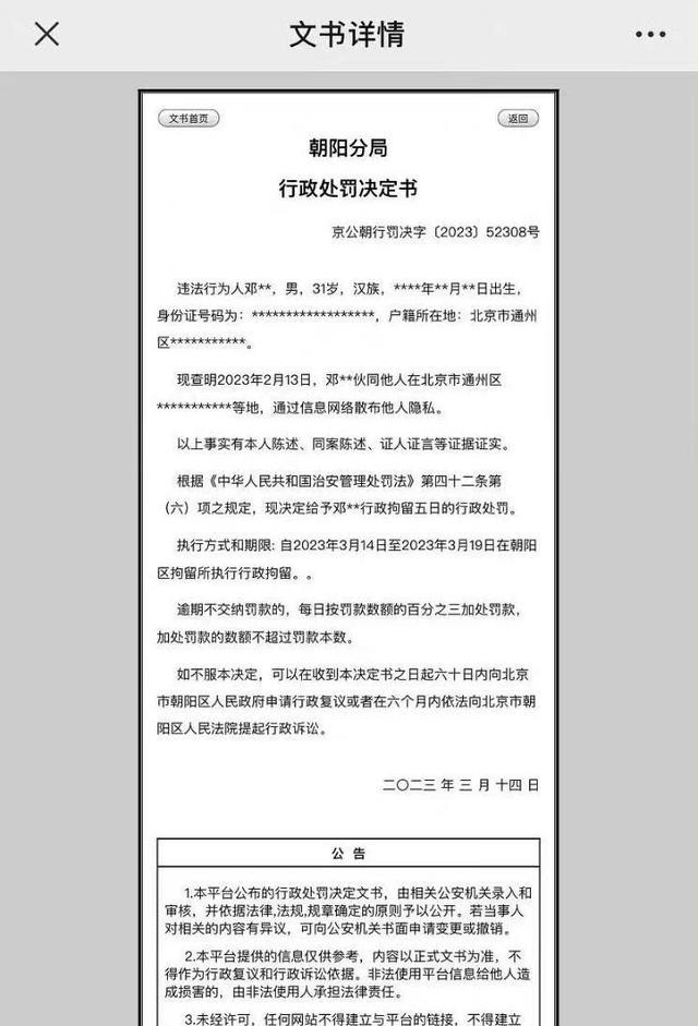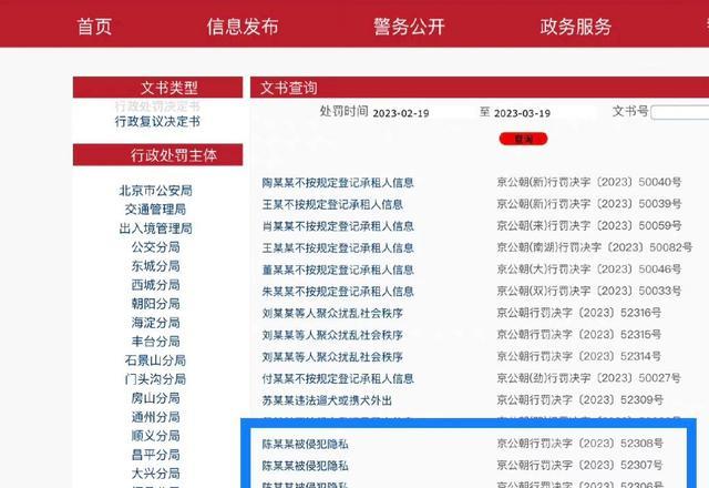 根据北京朝阳分局发布的行政处罚公告中可以看出,这一次被行政拘留的人有5位,原因是“陈某某被侵犯隐私。”