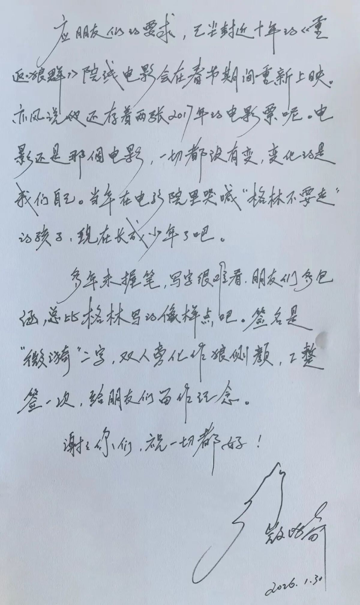近日,纪录片《重返狼群》再度爆火,成都画家、作家李微漪和狼王格林的故事感动了无数网友。今日,李微漪发布手写信,宣布已尘封近10年的《重返狼群》院线电影将会在春节期间重新上映。