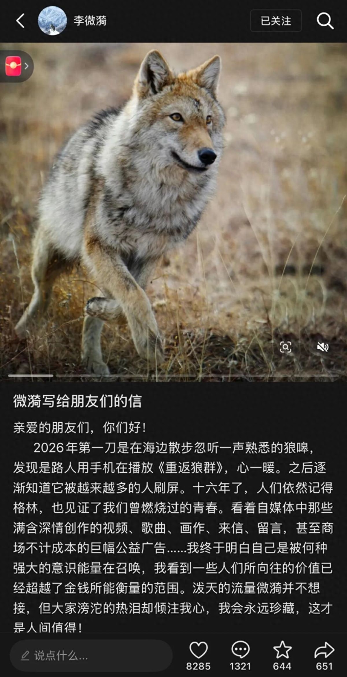 近日,纪录片《重返狼群》再度爆火,成都画家、作家李微漪和狼王格林的故事感动了无数网友。今日,李微漪发布手写信,宣布已尘封