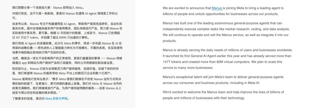 另一边,Meta也在官网确认该消息。在公告中,Meta补充了一些细节:一是Manus的产品服务将整合进Meta的产品体系,Meta更看重Manus在企业服务领域的能力;二是收购也包含了“人”,Manus团队打包加入Meta。