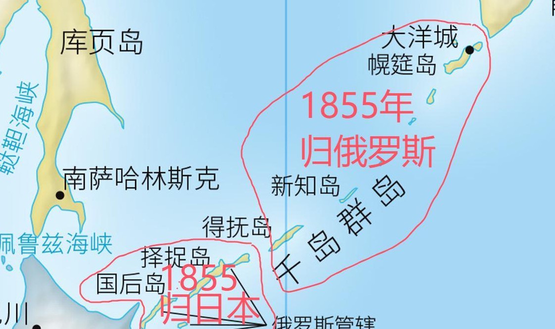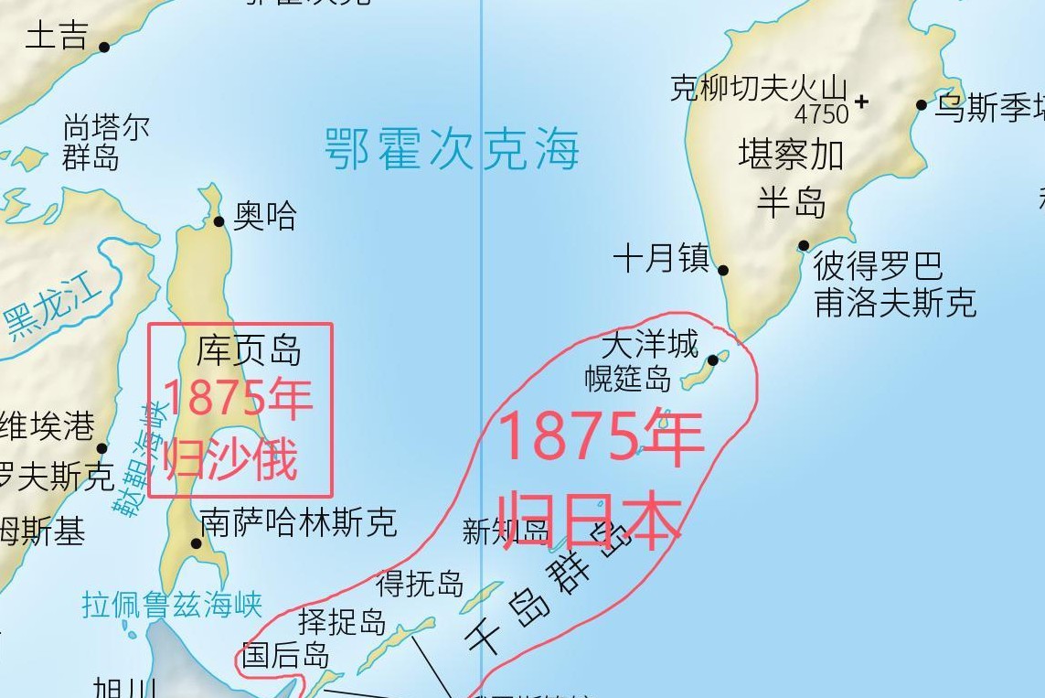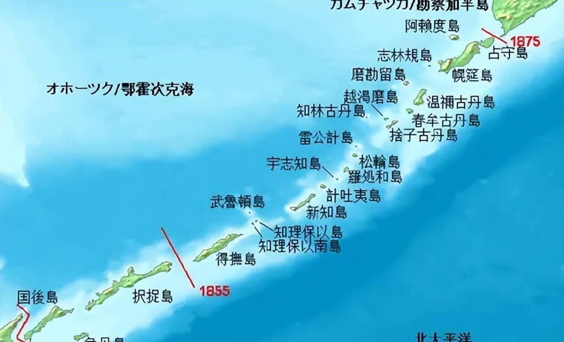 1855年,千岛群岛划界后,5年内形势改变。沙俄迫使清朝签订《中俄北京条约》,割让乌苏里江以东、包括库页岛在内的40万平方公里土地。日本对此不满,声称库页岛有其份额,因岛上南部有日籍居民,要求沙俄撤出。面对强硬的日本,沙俄虽感紧张但仍坚持不撤。经过多轮谈判,直至1875年,双方签署《库页岛与千岛群岛北部互换条约》。根据条约,库页岛归属俄罗斯,千岛群岛全部归属日本,北千岛群岛正式并入日本版图,日本领土向北延伸至距堪察加半岛仅11公里的占守岛。