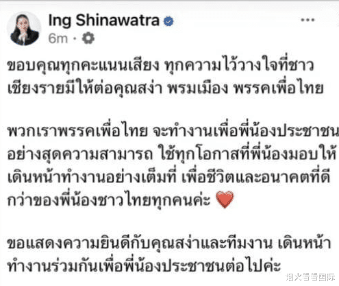9月14号,人民网消息,泰国前总理、为泰党党首佩通坦在社交媒体发文,向清莱府第7选区选民表示感谢!为泰党赢得清莱补选。