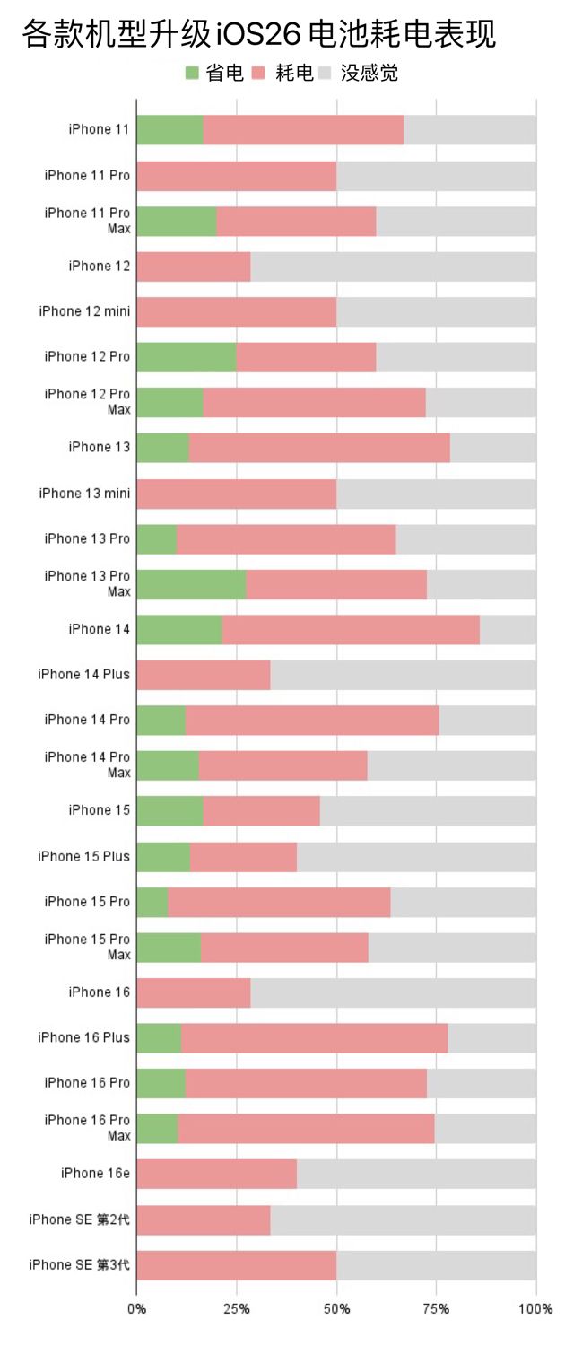 各款 iPhone 设备 iOS 26 电池耗电情况
