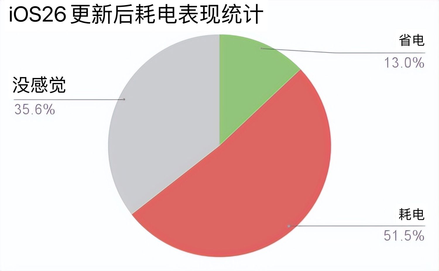 在级iOS 26正式版后,有51.5%的用户反馈耗电增加了,13%的用户表述更加省电了,其余大部分用户表示没感觉。
