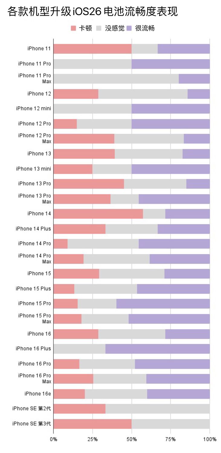 各款 iPhone 设备升级 iOS 26 顺畅度表现