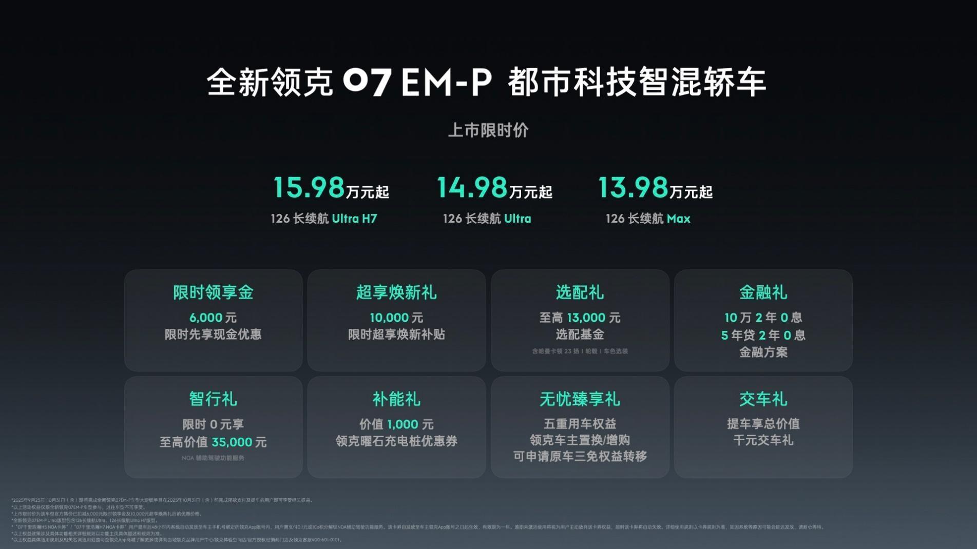 全新有为,极智新境。9月25日,都市科技智混轿车——全新领克07 EM-P正式上市。新车共推出126长续航Max、126长续航Ultra、126长续航Ultra H7三款配置版本,上市限时价13.98万元起。同时,全新领克07 EM-P还准备了限时领享金、超享焕新礼、选配礼、金融礼、智行礼、补能礼、无忧臻享礼、交车礼在内的8重限时福利。