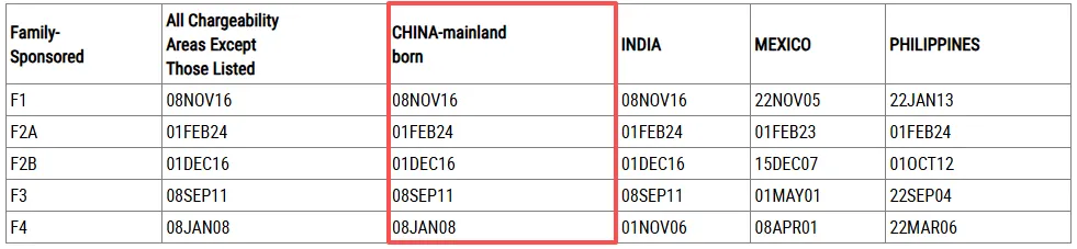 F1:公民21岁以上未婚子女类别,表A停留在2016年11月8日。表B排期无变化,停留在2017年9月1日。