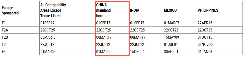 F2A:绿卡持有者配偶及子女F2A类别,表A停留在2024年2月1日。表B排期前进至2025年10月22日。