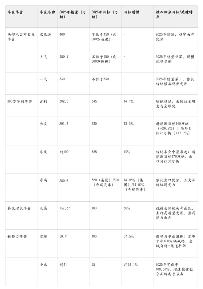 比亚迪、上汽和一汽三家暂时还未公布2026年的销量目标。其中,比亚迪和上汽是2025年国内车企销量的第一、第二,一汽则以330万辆成绩排在第三位。
