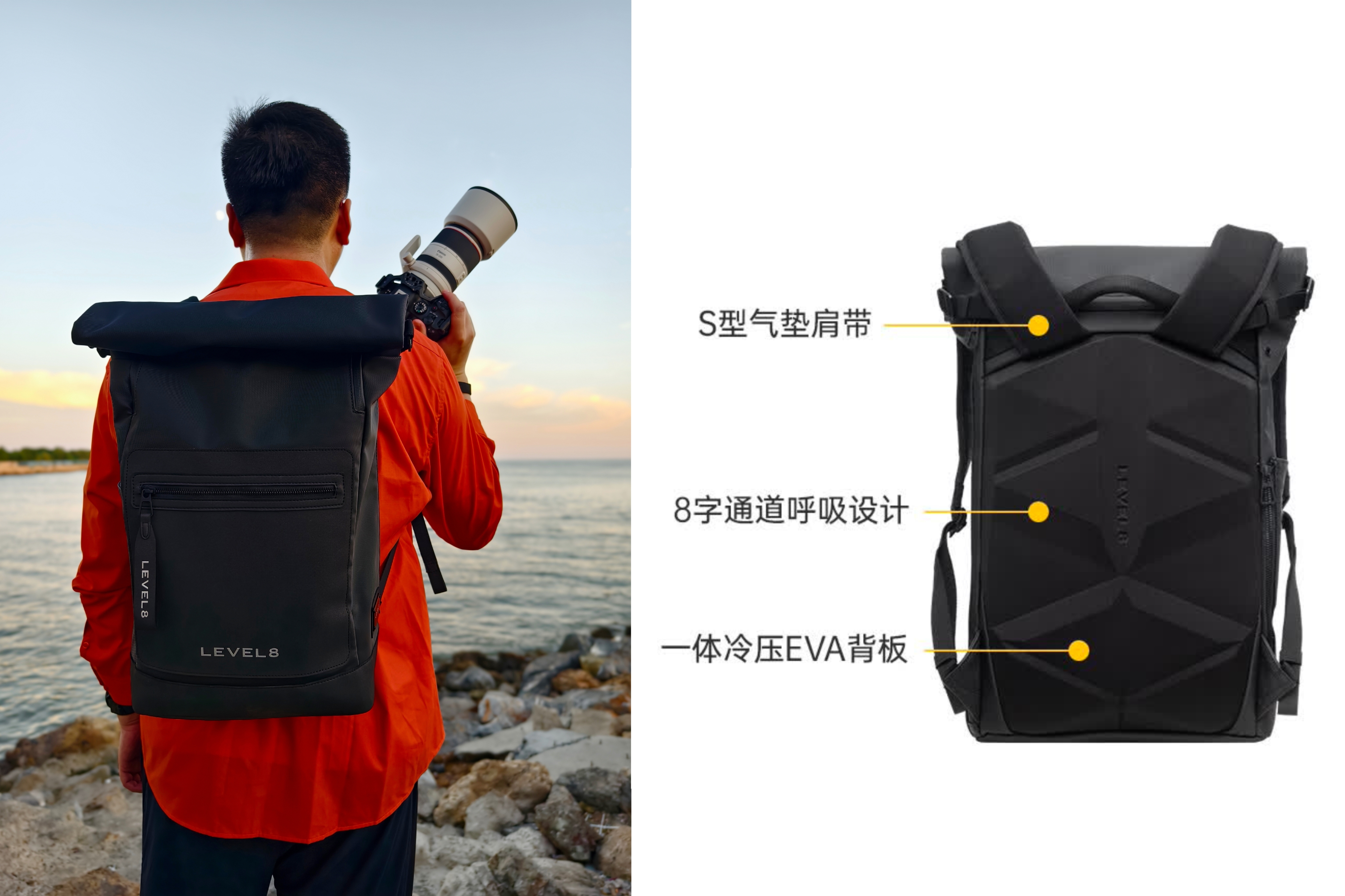 悬浮背负系统给背包长时间背负减轻很多压力。S型气垫肩带和8字通道呼吸设计在夏日背负也不会闷热。一体冷压EVA背板也增加了电脑的保护力。